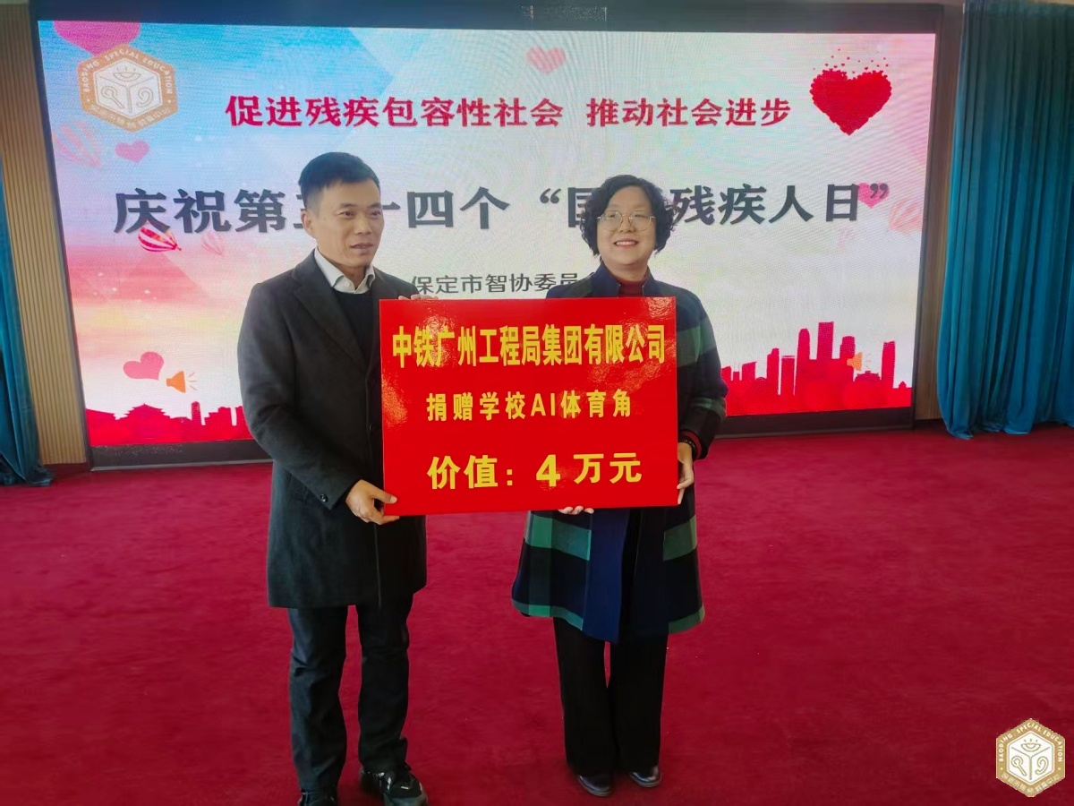 中铁广州工程局市政环保公司党委副书记、纪委书记、工会主席朱斌辉,保定片区党支部书记石剑;河北衡水老白干酒业股份有限公司保定大区经理王营,保定市英杰人力资源服务有限公司经理谷励,三家爱心企业代表带着对特殊学生的关怀,为我们带来了珍贵的礼品。秉持着企业担当与社会责任,中铁广州工程局集团市政环保公司朱斌辉书记上台为我校援建“AI 体育角”授牌并讲话,表达了对特殊孩子的关爱,希望能带动更多的社会力量关注特殊教育; 河北衡水老白干酒业股份有限公司保定大区经理王营先生代表企业为我校捐赠价值 15000 元的学习用品,为孩子们的求知之路送上坚实助力。保定市英杰人力资源服务有限公司经理鼓励为学校学生捐赠了价值 1 万元的校服,让孩子们在冬日里感受到贴心的温暖。学校领导接受捐赠并为爱心企业颁发捐赠证书。