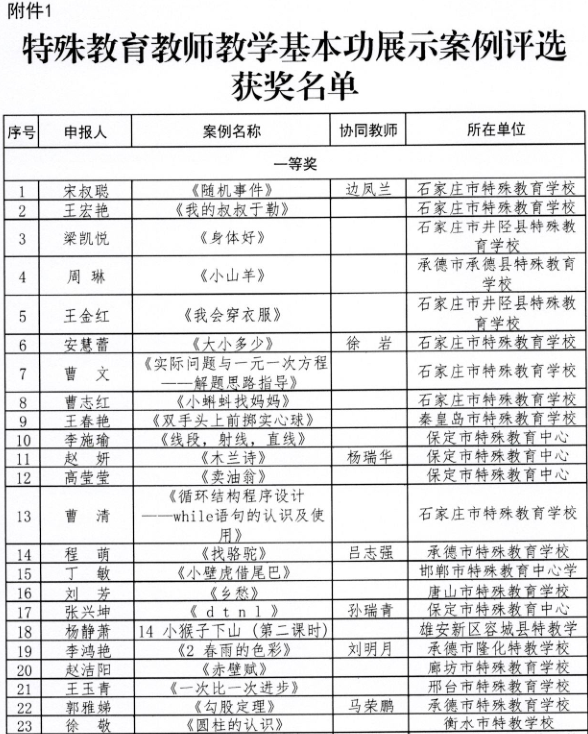 特别值得自豪的是2019年5月,学校聋人足球队代表河北省参加全国第十届残疾人运动会获得冠军,创造历史最佳战绩!在2019年10月全国“三菱友谊杯”第五届残疾人民间足球争霸赛总决赛上,再次代表河北省喜获全国冠军! 2021年6月获第十一届残疾人运动会男子聋人足球亚军!学校啦啦操队于2021年7月荣获全国啦啦操联赛(保定站)公开残障组•集体花球自选动作第一名!2023年4月荣获全国啦啦操联赛(保定站)公开残障组•集体花球自选动作第一名!2023年10月获河北省首届全民健身大赛啦啦操总决赛自选花球冠军,在邯郸市举办的河北省第十届残疾人运动会中,学校获得21金、33银、17铜的优异成绩。学校盲生董建是魔方吉尼斯记录盲人保持者,盲人魔方队参加了全国中学生智力运动会,与正常人同台竞技,获得四个全国一等奖。聋人舞蹈队《茉莉花季》获第七届特教学校学生艺术汇演舞蹈类一等奖,舞蹈《听》获河北省第六届特教学校艺术汇演二等奖。盲生跳绳、聋轮滑队在全国省市大赛中也屡获殊荣。