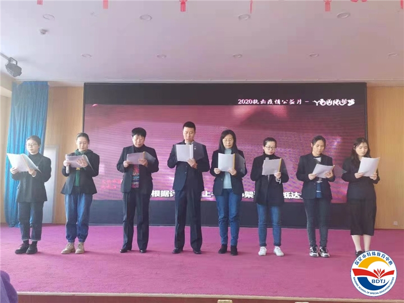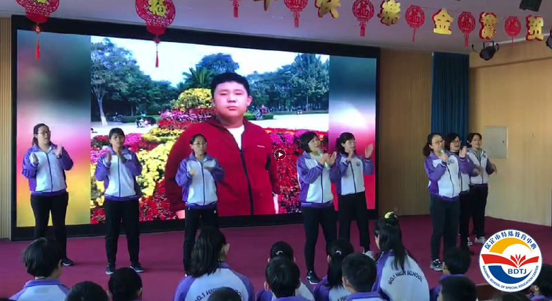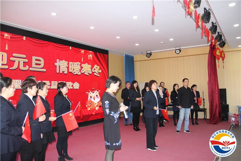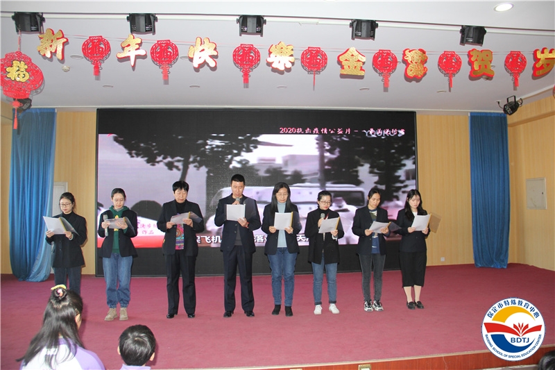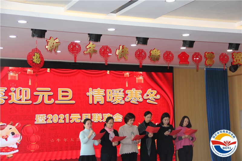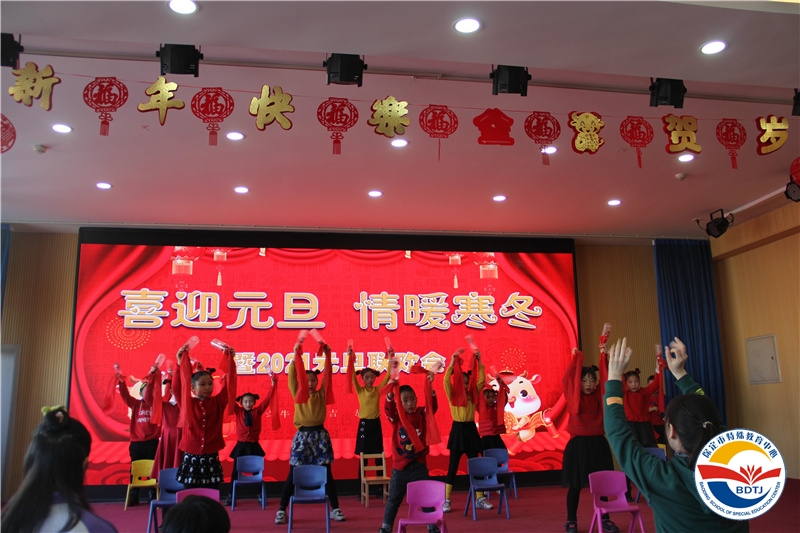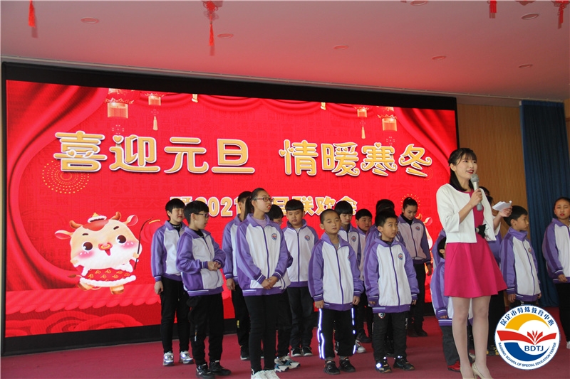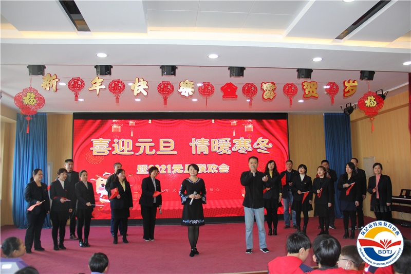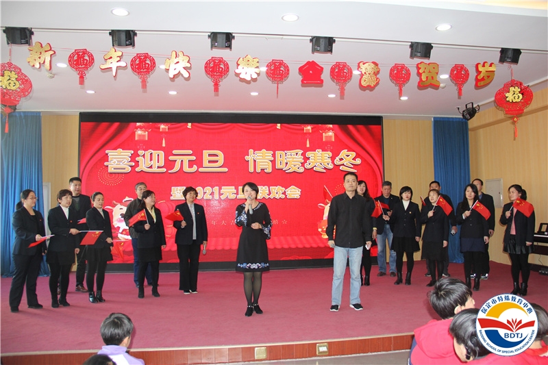 武美英校长、周建忠副校长、曹挺副校长,满红宇副校长、赵娜主席、全体教职工、启聪部和启明部学生欢聚一堂,在喜庆祥和的氛围中共庆2021年的到来。