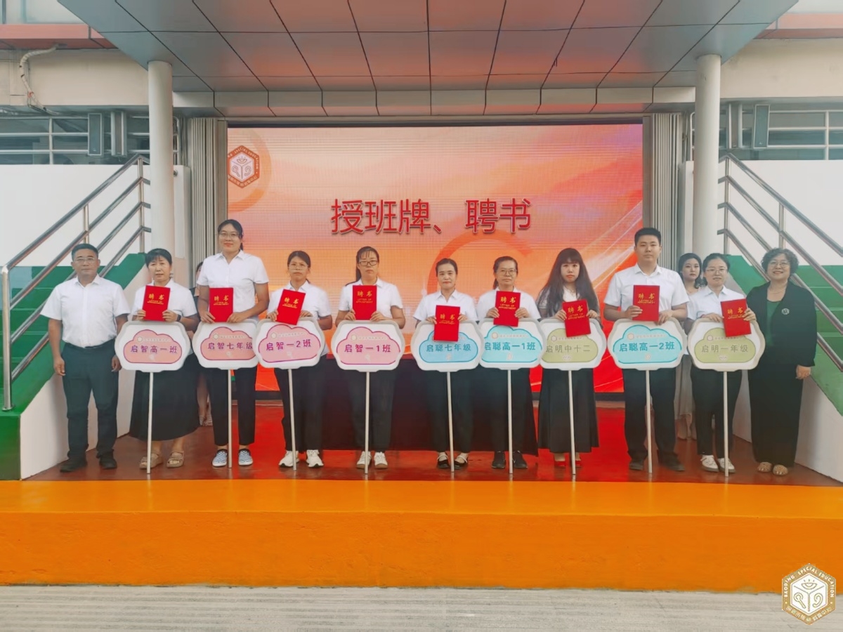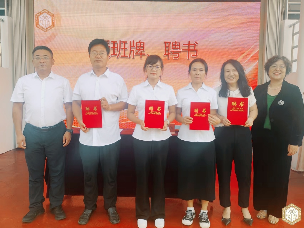 武美英书记、王涛校长为起始班主任授班牌,并为班主任颁发聘书。