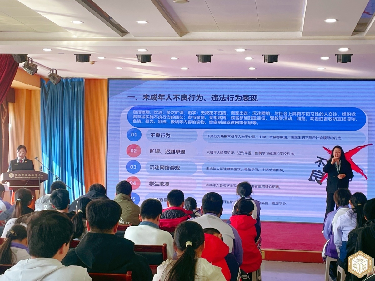 讲座中,郭海英副主任结合自身丰富的检察办案经验,以“案例+法条+解读”的形式,从四个核心维度为师生们展开深度讲解。首先,她清晰界定了未成年人不良行为、一般违法行为与严重违法行为的概念、具体表现及对应处罚措施通过层层递进的解读,让同学们直观区分不同行为的法律边界。
