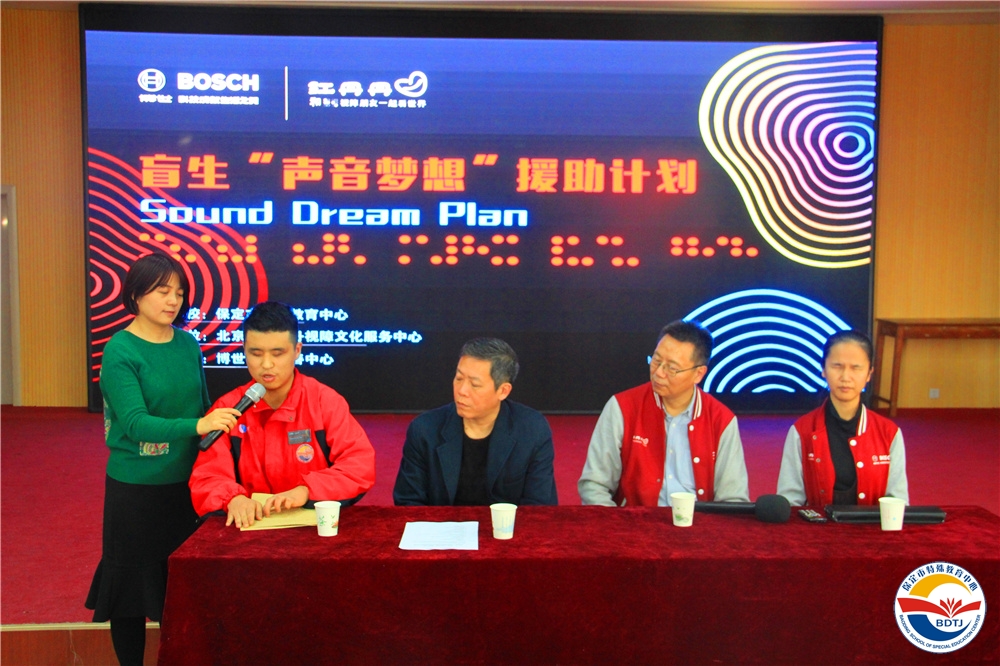 在国际助残日到来之际,11月21日下午,在特殊教育中心三楼多功能厅,成功举行“声音梦想”援助计划——视障青少年语言基础兴趣班开班及挂牌仪式,“声音梦想”援助计划正式落户该校!此计划由北京市红丹丹视障文化服务中心主办,博世中国慈善中心资助,支持全国七所盲校搭建“声音梦想录音室”,保定市特教中心是第四个项目点。