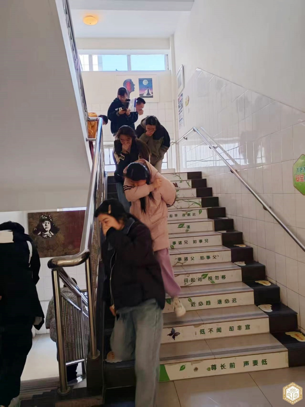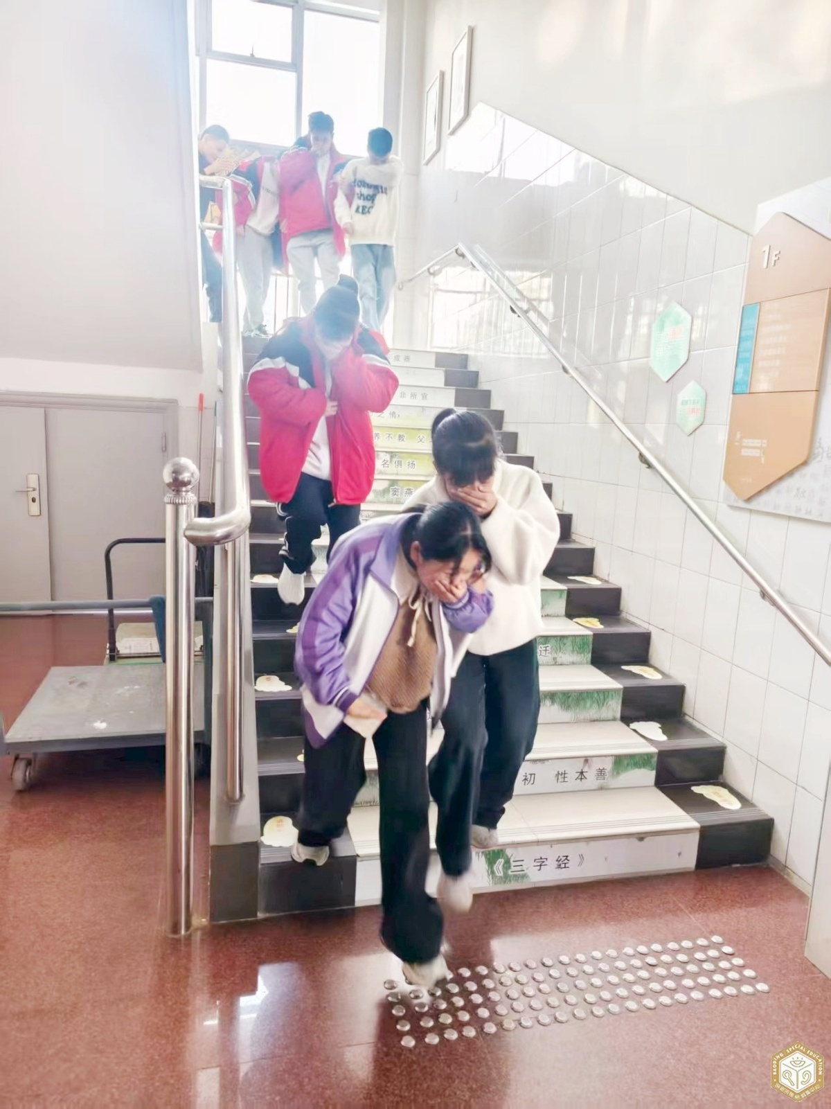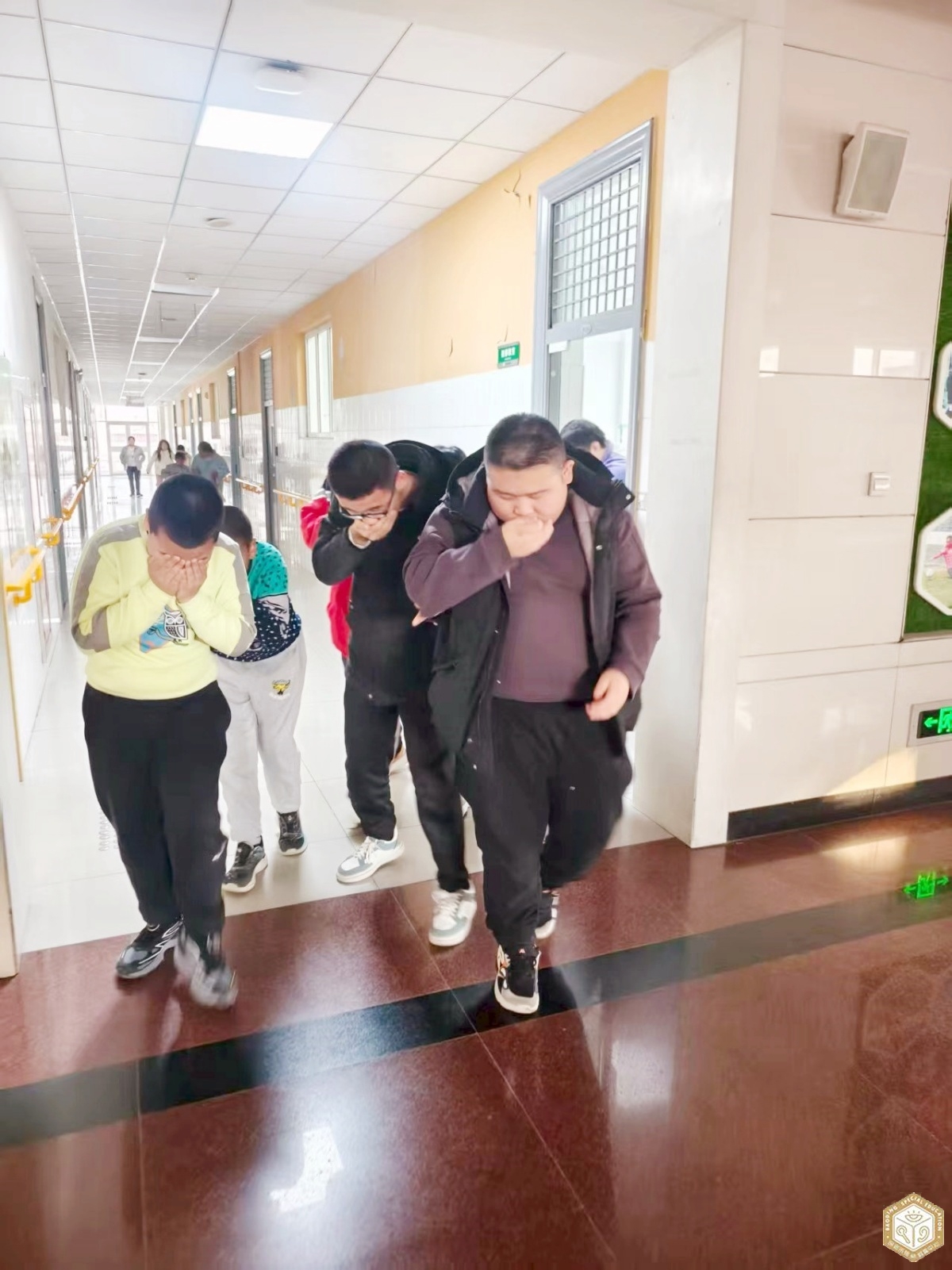 随着演练信号员急促的演练口号声,演练正式拉开序幕。启聪、启智、启明三部的学生在教师和陪读家长的耐心引导下,弯腰低姿、捂住口鼻,沿着预定路线紧张有序地撤离教室。全体人员反应迅速、配合默契,仅用时2分47秒便全部安全抵达校门口指定安全区域。